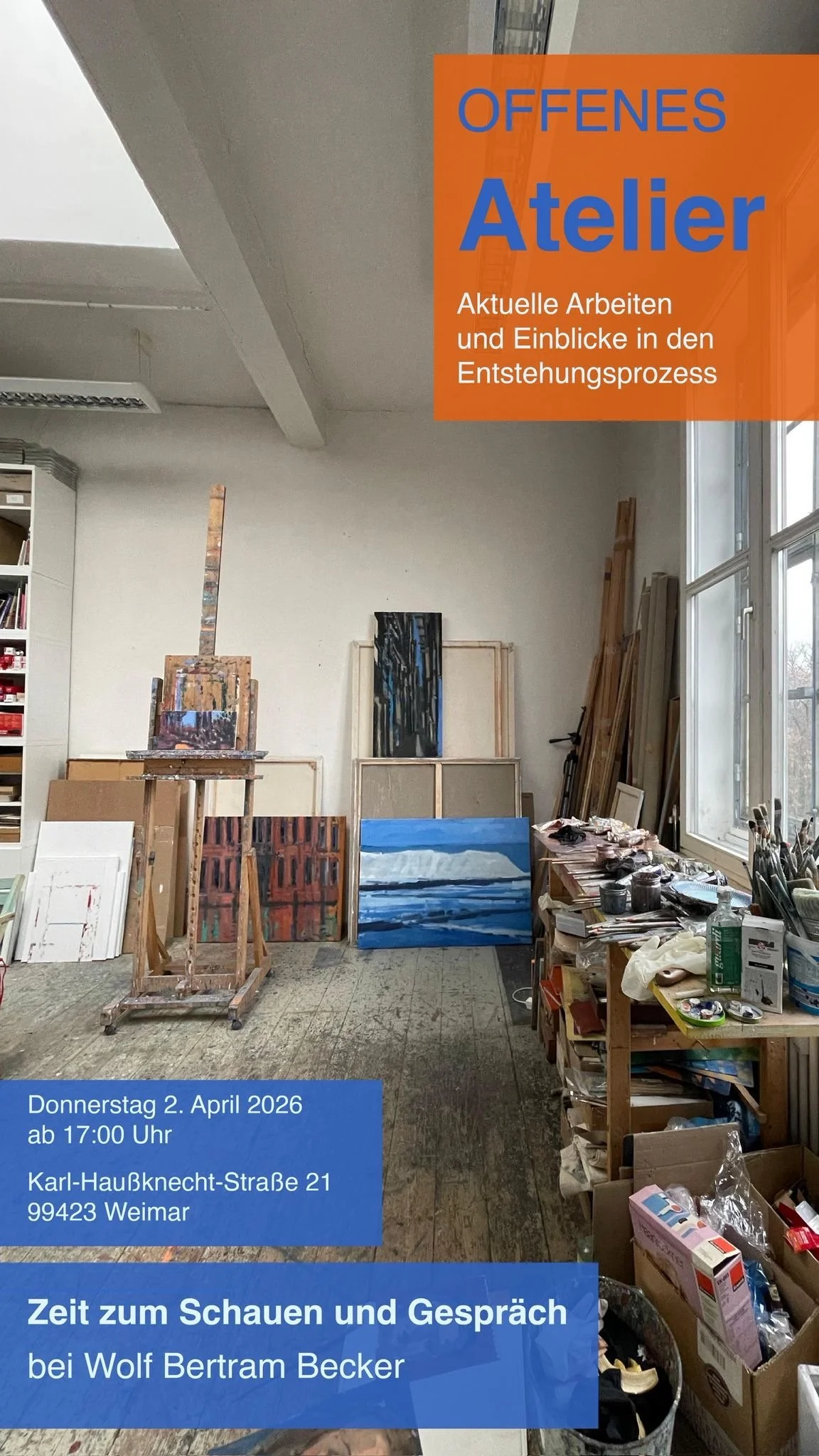 Herzliche Einladung zum Offenen Atelier am Donnerstag, 2. April 2026 in die Karl-Haußknecht-Straße 21. Beginn wieder 17:00 Uhr.